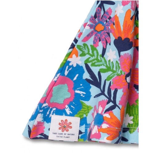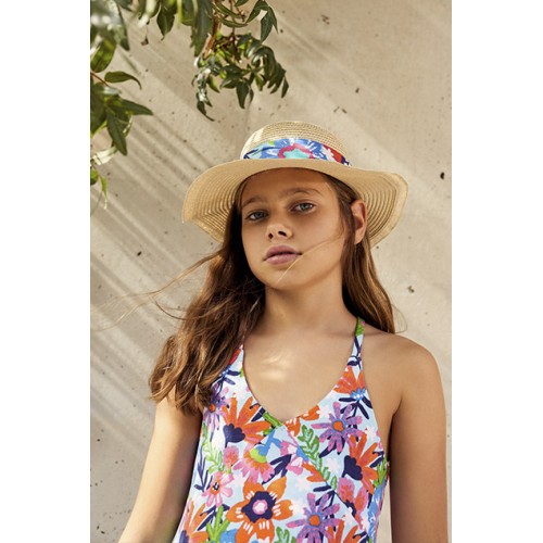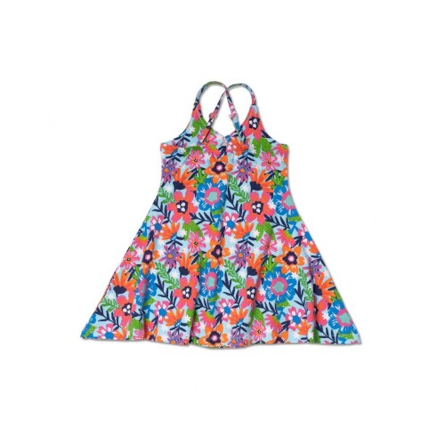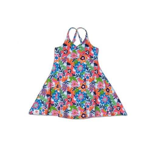 Knitted dress with colorful floral print and crossed straps on the back for a girl.