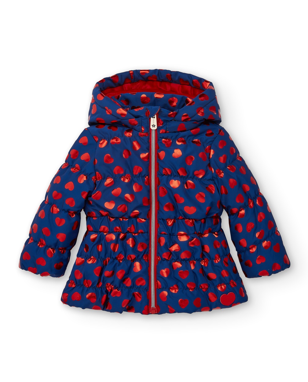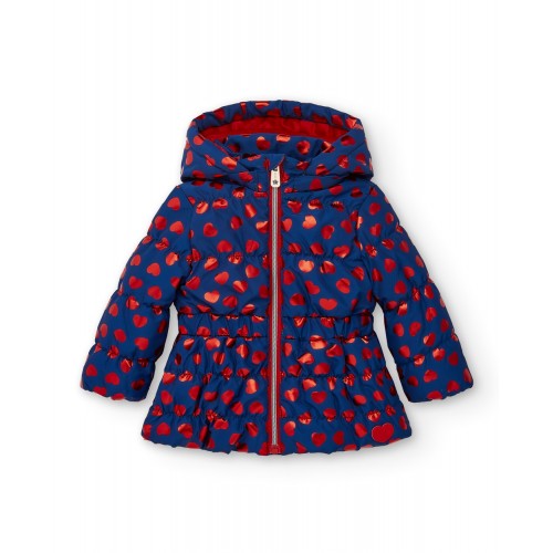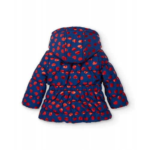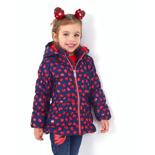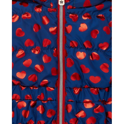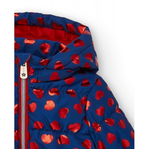 Technical parka for girls in navy blue with a charming red heart print. This parka is