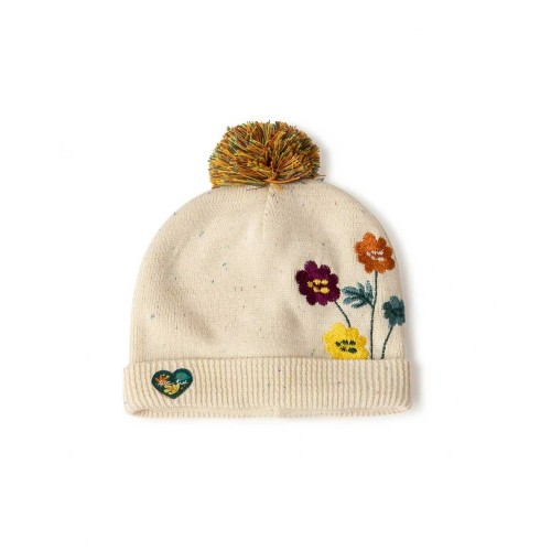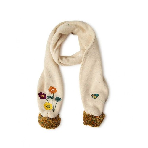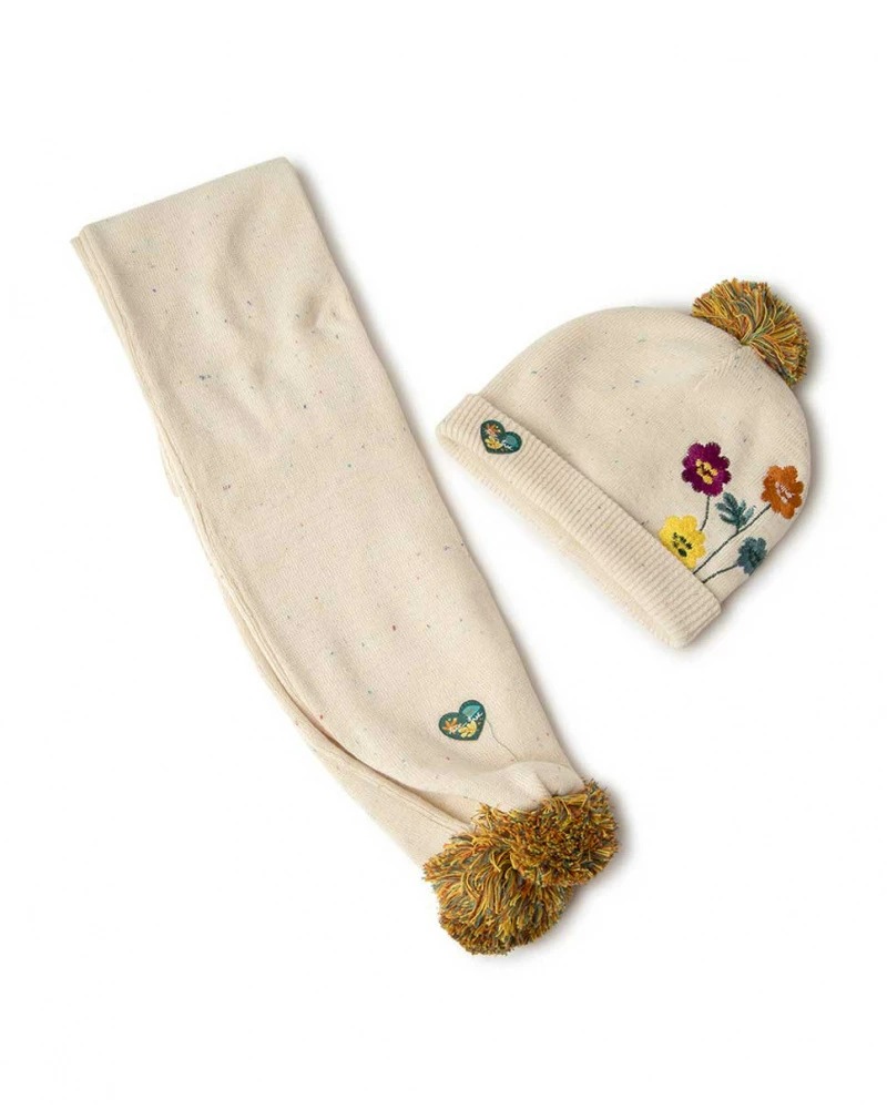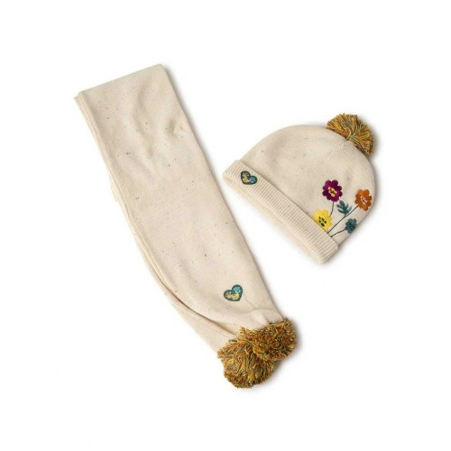 Beige beanie with flower embroidery and pompom and beige knit scarf for girl with pompoms.