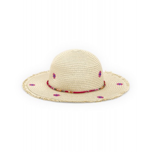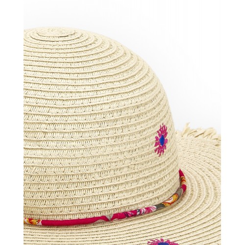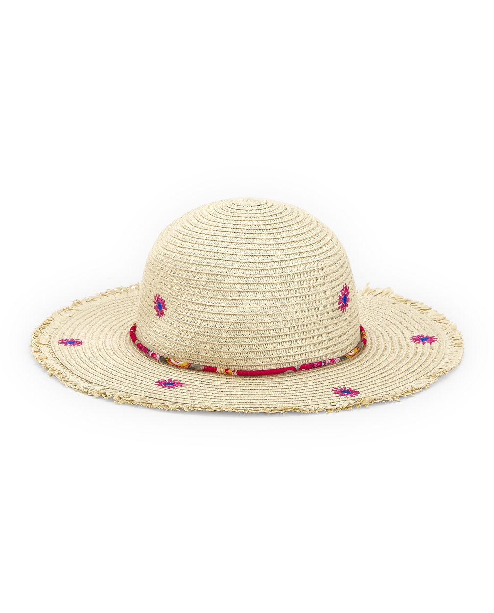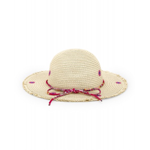 Beige raffia hat with embroidered flowers and decorative ribbon for girls.