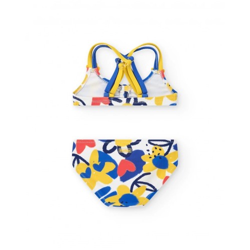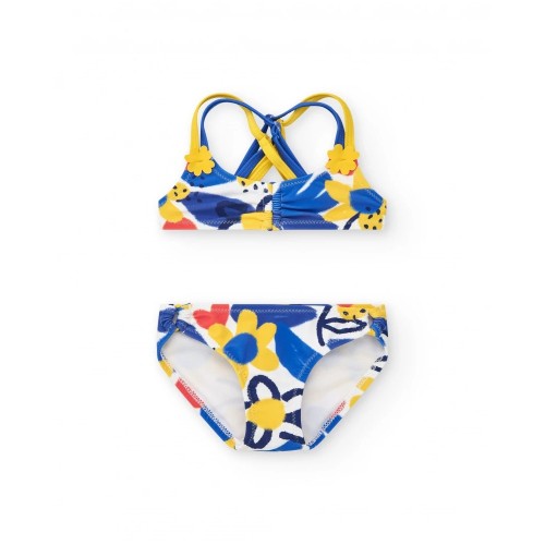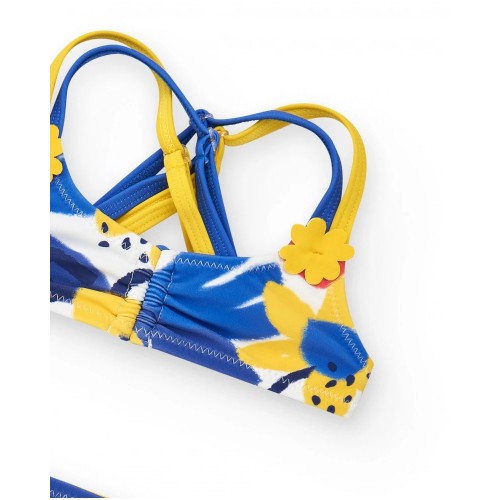 Girls' bikini in blue and yellow tones, with a floral print and brightly colored details.