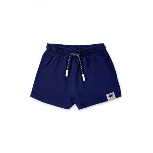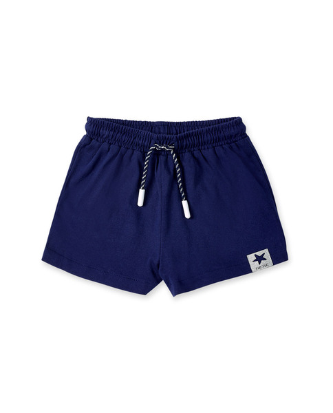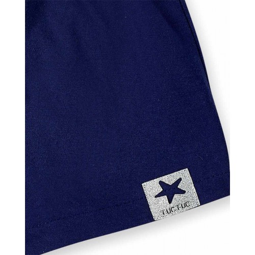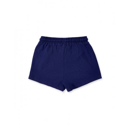 Navy blue knitted shorts with elastic waist and drawstring for girls.