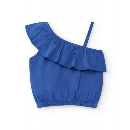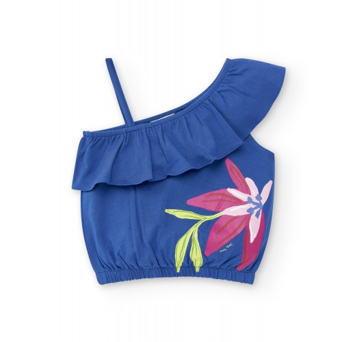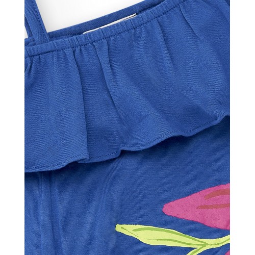 Two-piece knitted set for girls. Fuchsia pink tank top with colorful floral print and front knot. Bl..