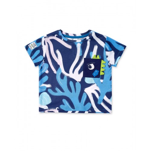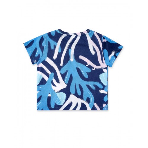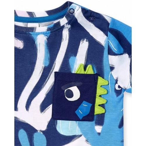 Blue knit t-shirt with seaweed print and side pocket for boys