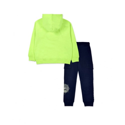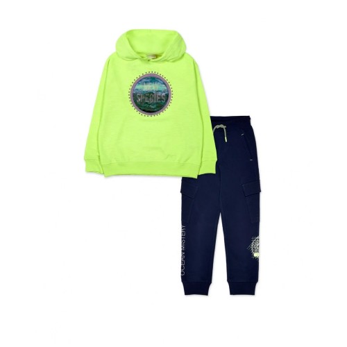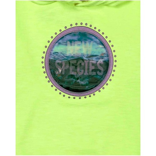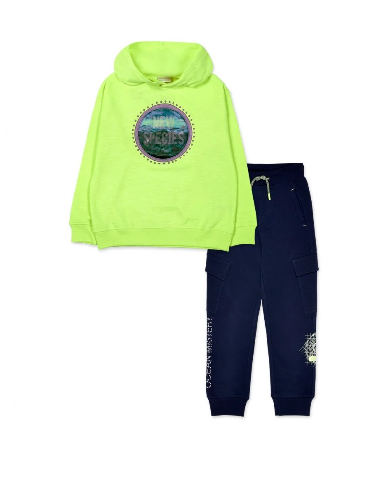 Two-piece plush set for a boy. Yellow plush sweatshirt with a seabed hologram and hood.