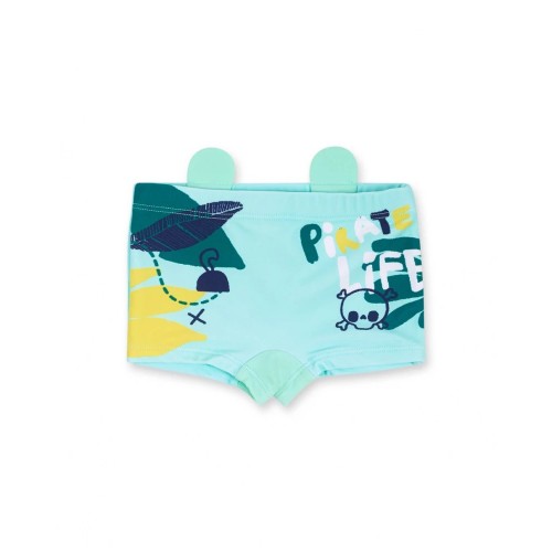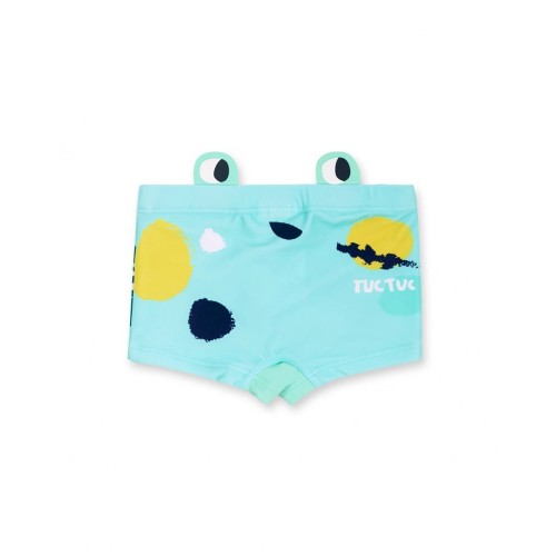 Blue boxer-style swimsuit with a map print and frog-eye appliqué for a boy.