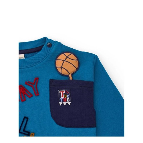 Boys' blue sweatshirt and pants set with a sports-themed print and embroidery.
