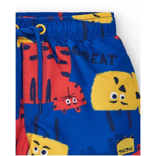 Boys' blue swim shorts featuring a tropical-style animal print and an adjustable elastic waistband for comfort.