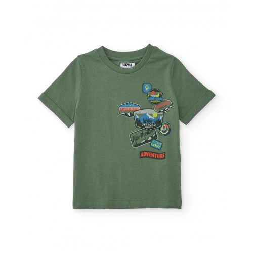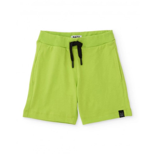 Boy’s outfit consisting of a khaki-green t-shirt and lime-green bermuda shorts. The t-shirt,