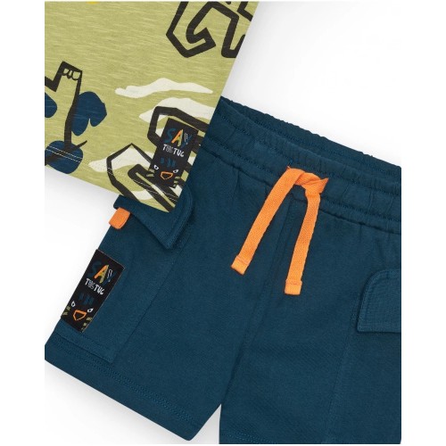 Green twill Bermuda shorts for boys with cargo pockets and adjustable drawstring