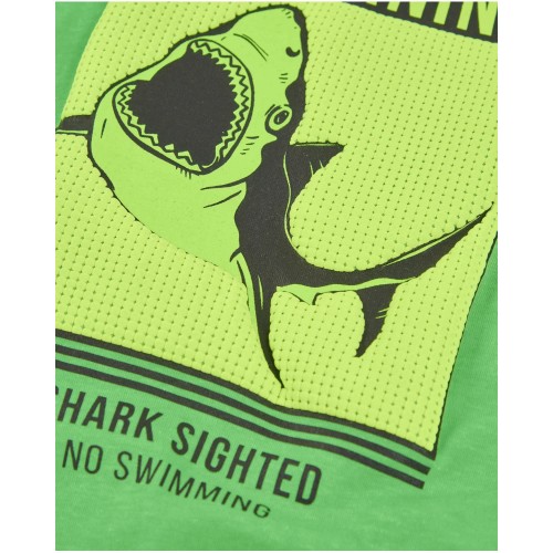 ensures comfort on warm days. It features a bold graphic print with a shark