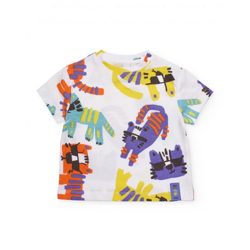The t-shirt, with a white base, shows a colourful artistic-style animal print that adds a lively and