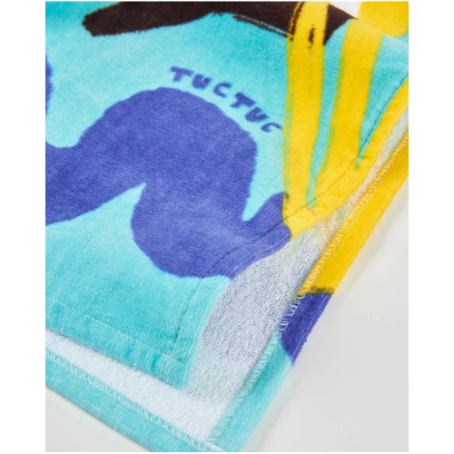 drying off and keeping warm after swimming at the pool or beach. It features a fun,
