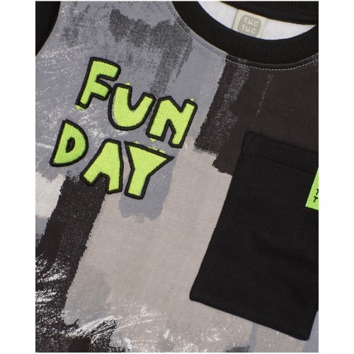 Boys' two-piece fleece set. Black sweatshirt with a gray brushstroke print and a green "FUN DAY"