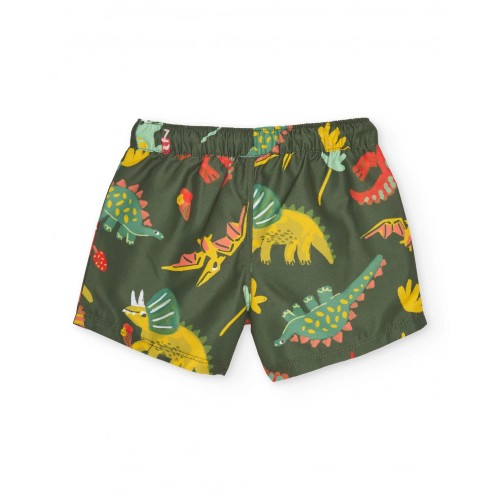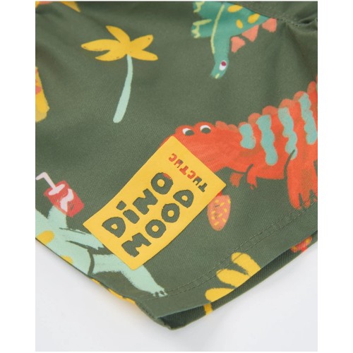 Swimsuit for boys in khaki green with an all-over dinosaur print in red, yellow and turquoise tones,