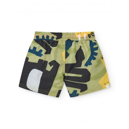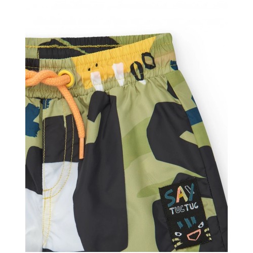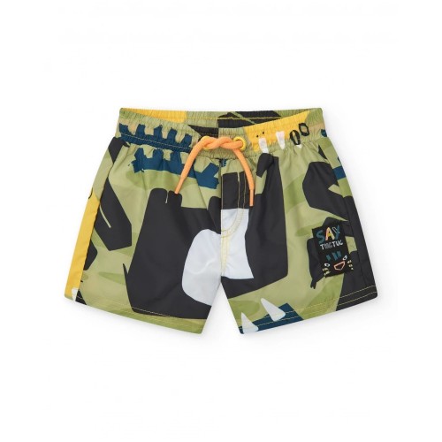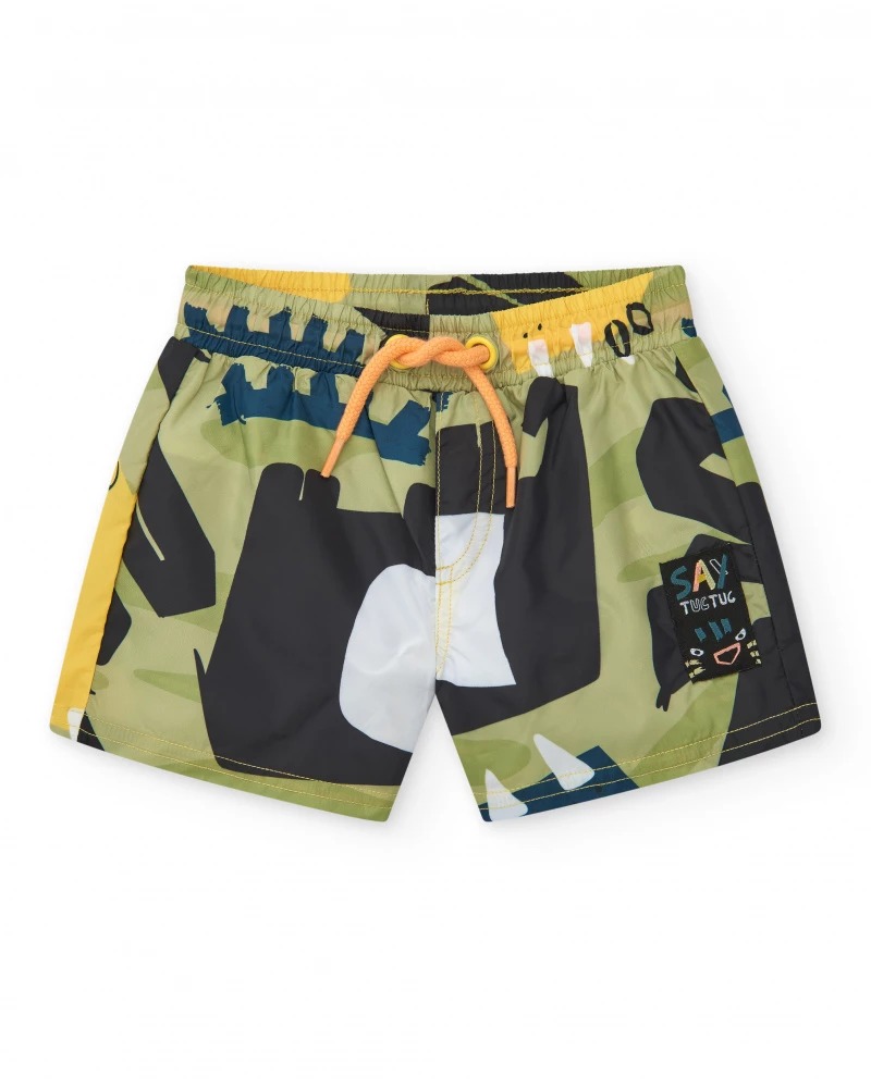 Boys' swim shorts with a green, black, and yellow print. Includes an elastic waistband