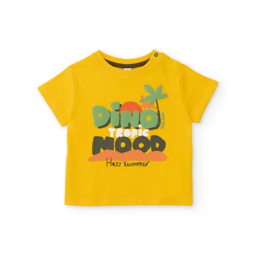 to its comfortable and versatile design. It includes a yellow T-shirt with a fun front print and a green