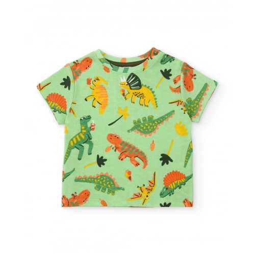 T-shirt decorated with bright dinosaur illustrations, adding a cheerful and playful touch. The dark green