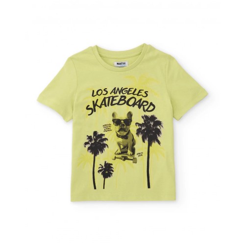 Boys’ set featuring a lime-yellow T-shirt and dark grey bermuda shorts. The T-shirt, made