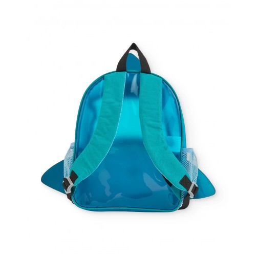 Backpack for boys in turquoise, featuring a playful pirate-shark design. It includes a top fin