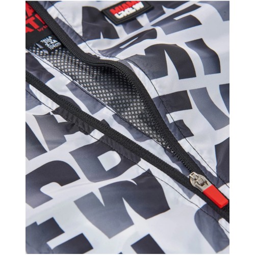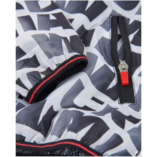It features an all-over typographic print in grey and black with red details, giving it a