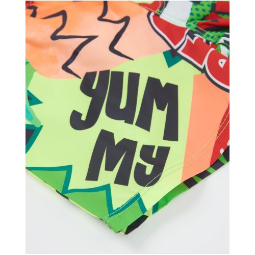 throughout the day at the pool or beach. They feature a multicolour comic-style print with fruity