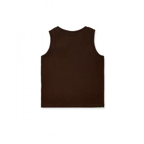 Knitted set, two orange and brown pieces for a boy. Orange t-shirt with tropical print. Brown Bermud..