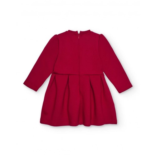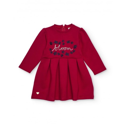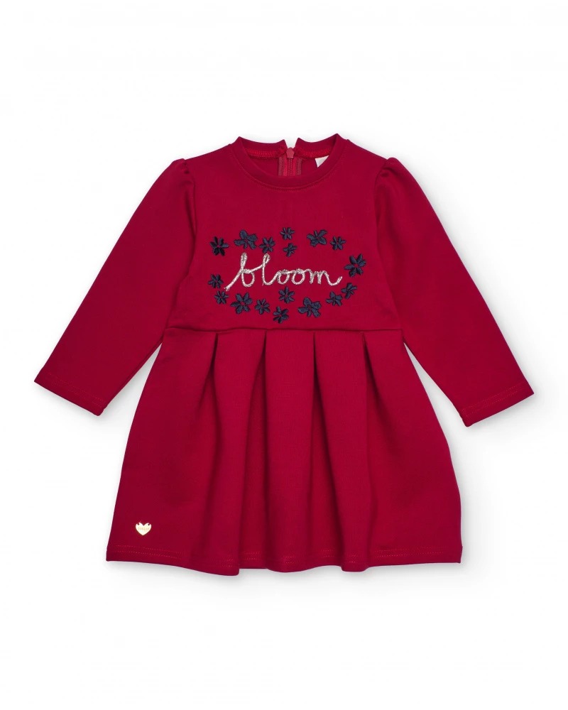 Girls' long-sleeved burgundy dress with a pleated skirt and embroidered detailing