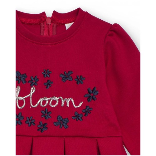 on the chest with the word "bloom" and contrasting flowers. Concealed back zipper