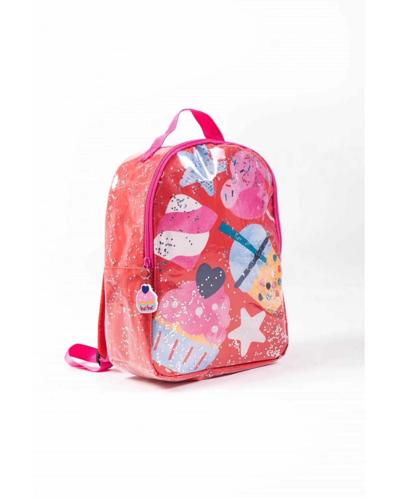 Coral-colored girls' backpack with a cheerful candy and star print in bright hues.