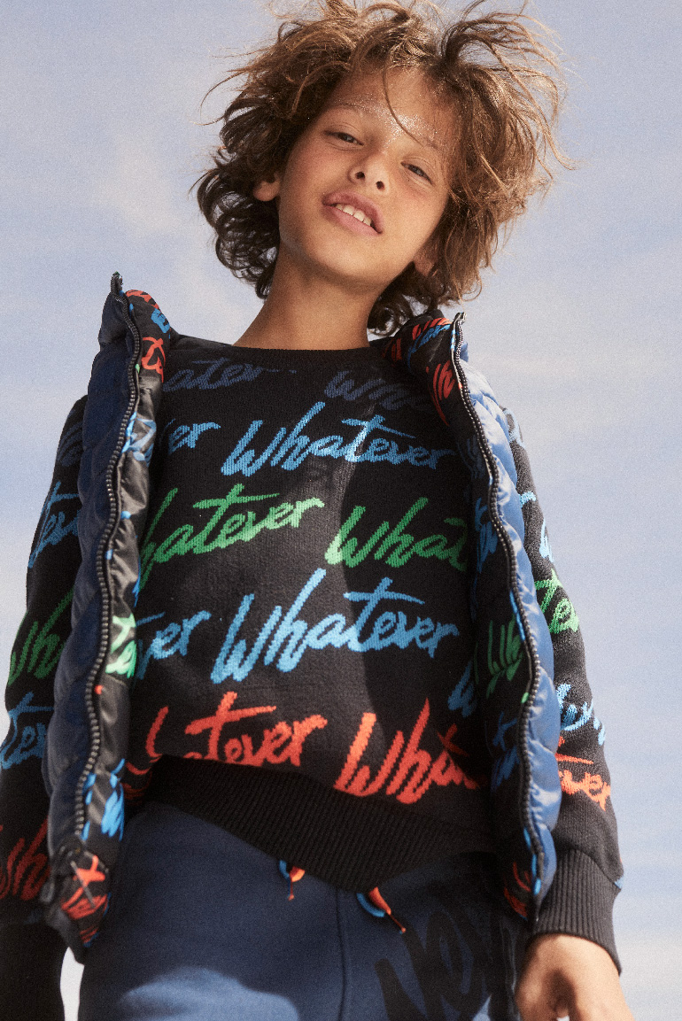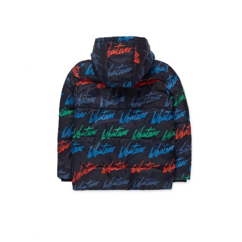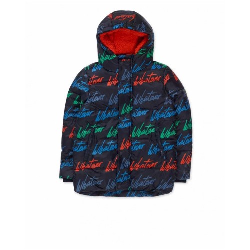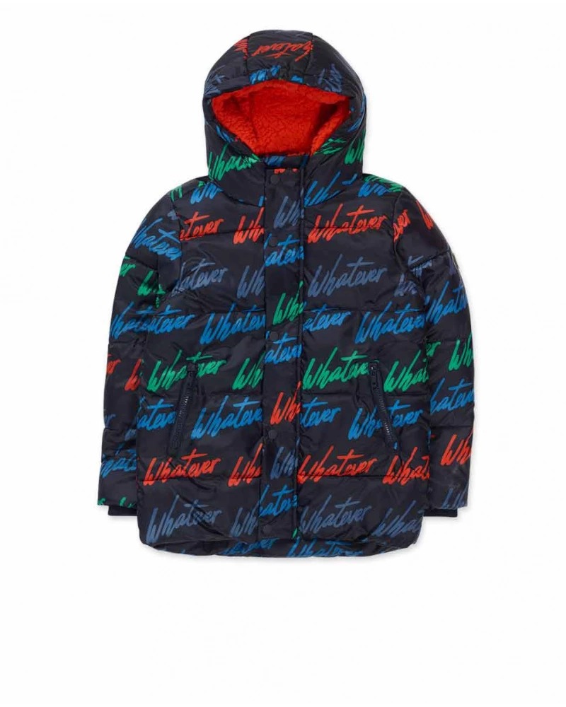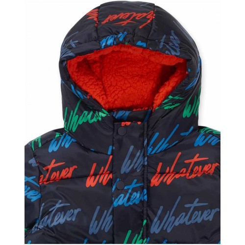 Flat, blue coat with colorful letter print, front pockets and front zipper closure with hood for boy