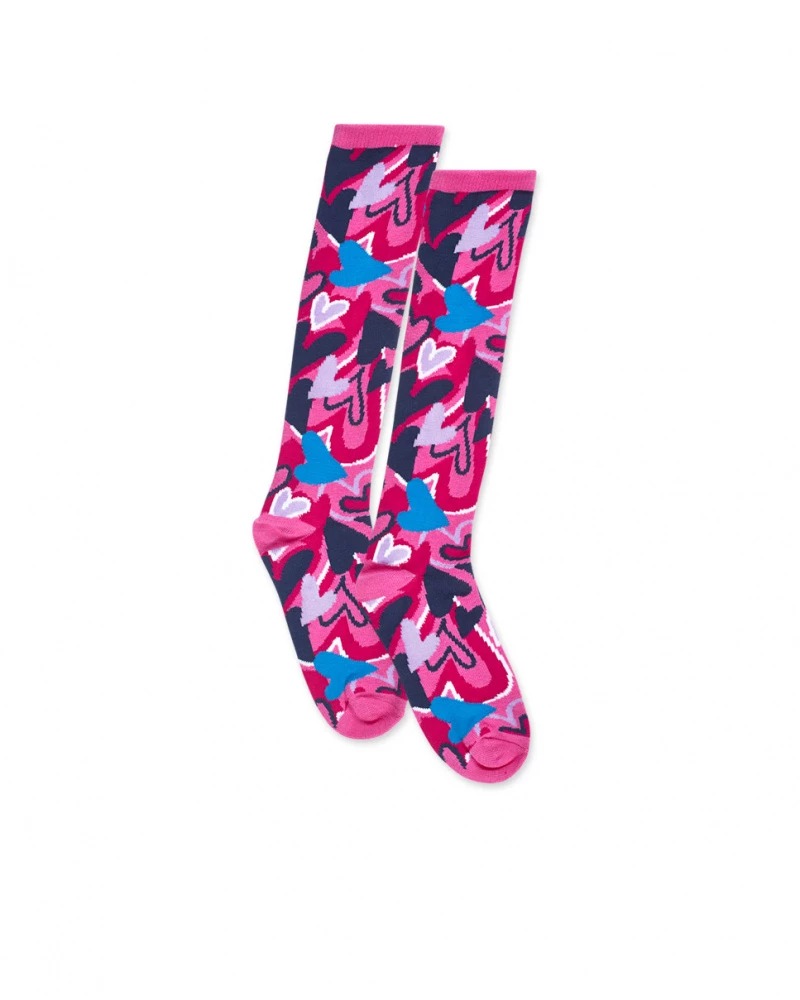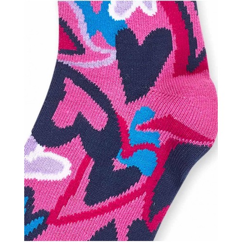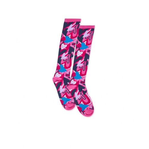 Fuchsia socks, with a blue, white and lilac heart print for girls.