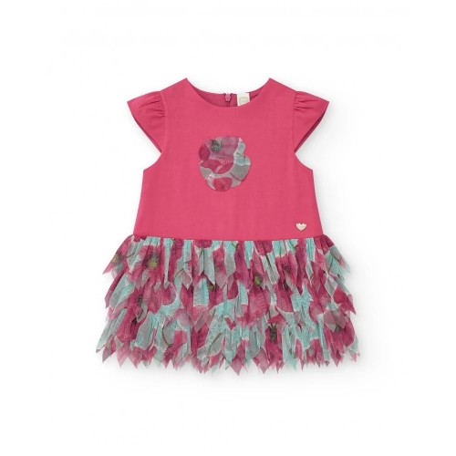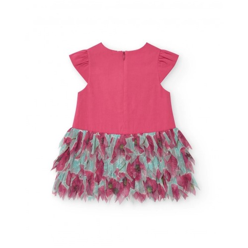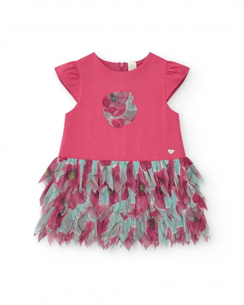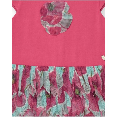 Fuchsia flat dress for girls with a floral appliqué on the chest and a skirt decorated