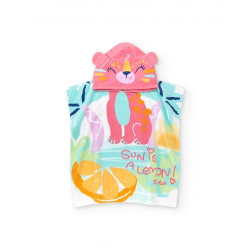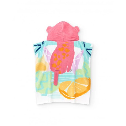 Girls' poncho towel with a colorful print featuring tropical illustrations.