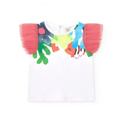 Set for girls consisting of a white knitted T-shirt with pink tulle sleeves and a multicoloured
