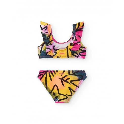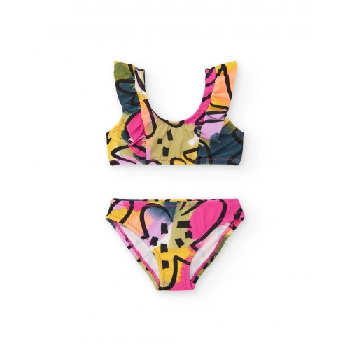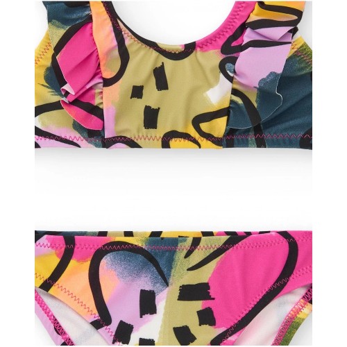 Girls' bikini in lilac with a multicolored print. The top features ruffled straps,
