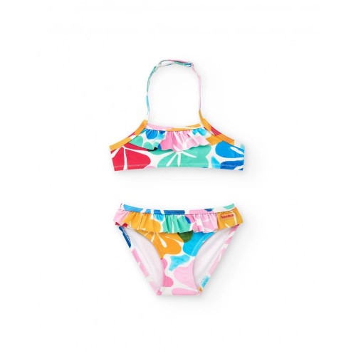 Blue girls' bikini with a floral print. The top features a halterneck design