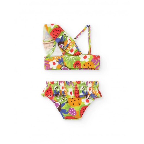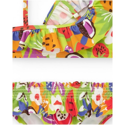 Two-piece girls' bikini with a multicolored design and fruit print. The top