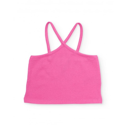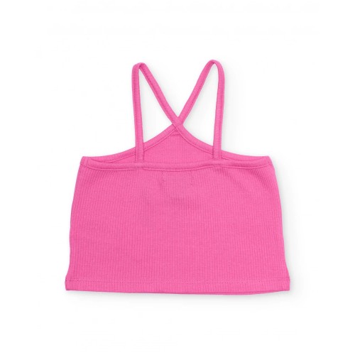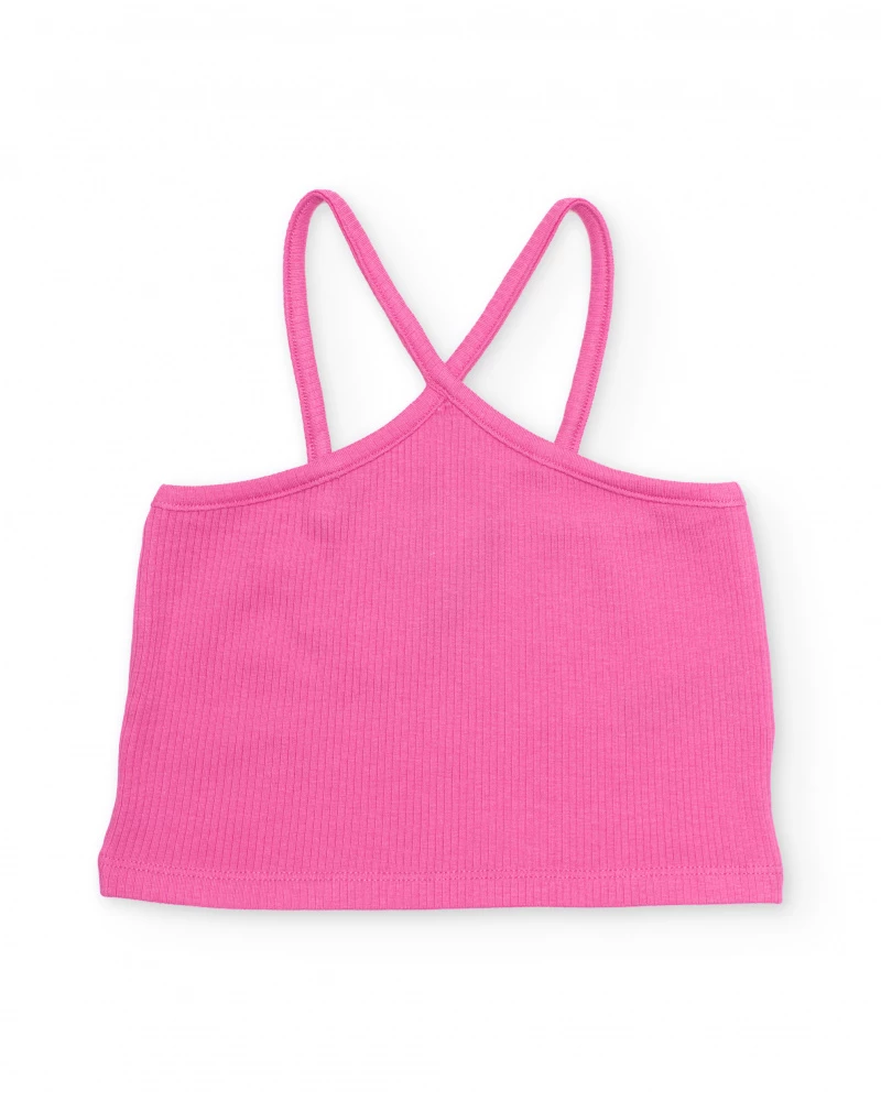 Girl’s top in fuchsia pink, made from a soft, ribbed, stretchy fabric that provides a comfortable fit