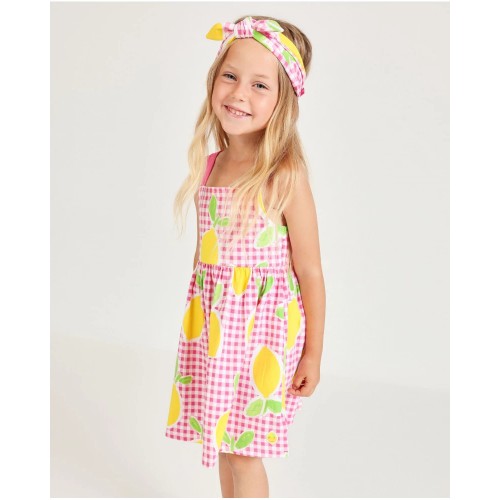 the day. It features wide contrast straps and a pink gingham print decorated with yellow lemons and