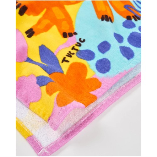 off and keeping warm after swimming at the pool or beach. It features a cheerful