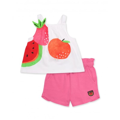 Girls’ set consisting of a white sleeveless top and pink shorts. The top features a large, vibrant