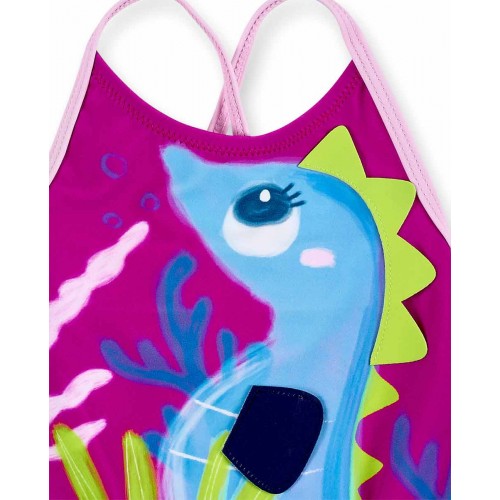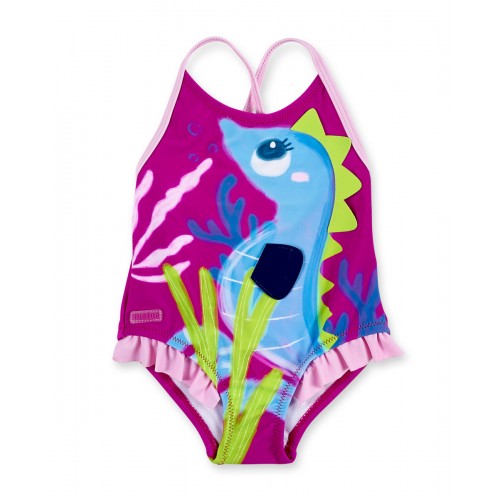 Lilac swimsuit with seahorse print, crest appliqué and ruffles for girls.