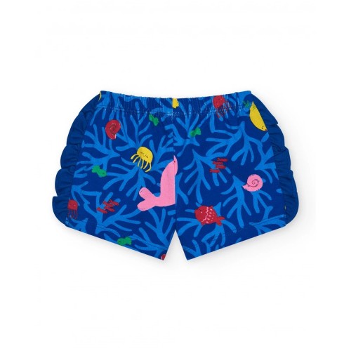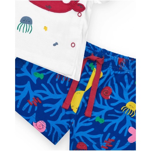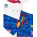 colourful jellyfish. Includes blue shorts with a marine print of corals and underwater creatures, with a