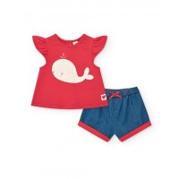 Knitted set for girls, consisting of a white T-shirt with ruffled sleeves and embroidered red whale and