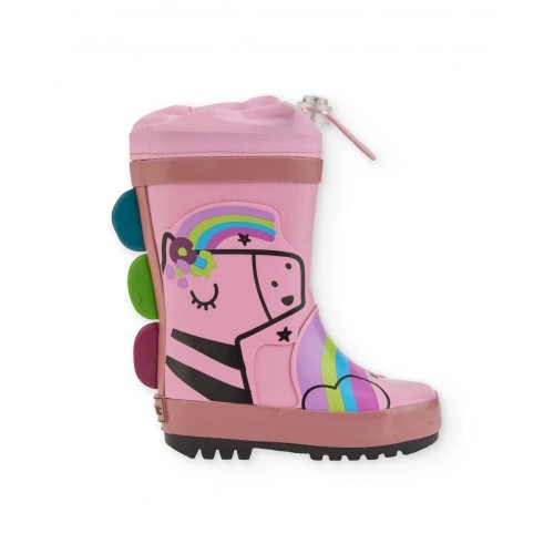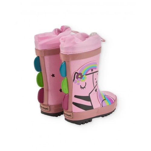 Pink rain boots for girls with fun raised details of a unicorn, rainbow, and clouds.