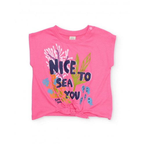 in pink, features a marine-themed print with corals and a decorative message, along with a knot detail at