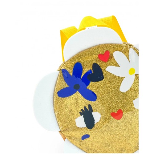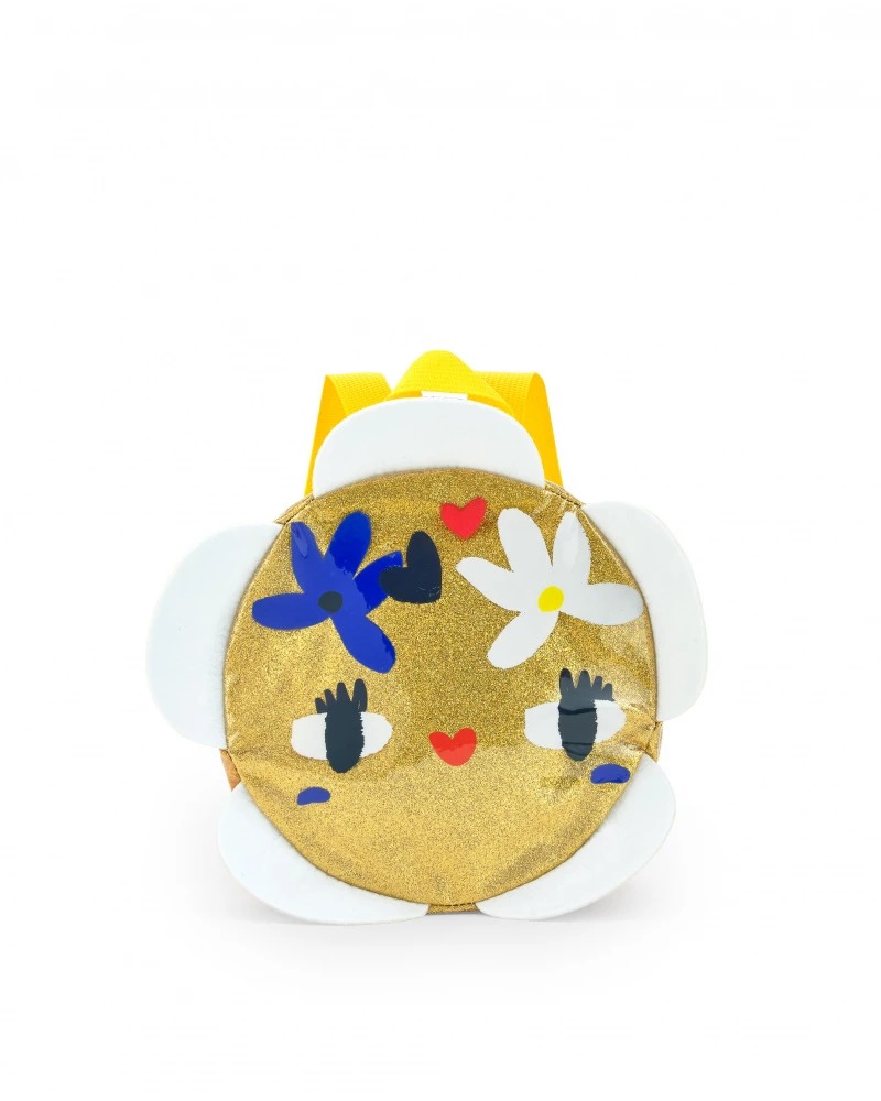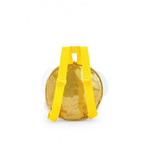 Girls' round backpack in shiny gold with adjustable yellow straps for a comfortable fit.