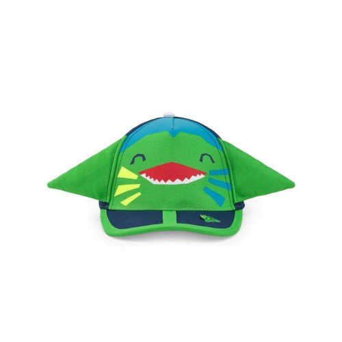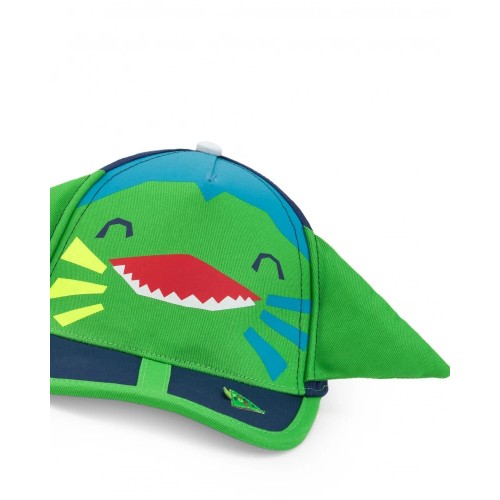 Green peaked cap decorated with a smiley face design and ear appliqués on the sides.