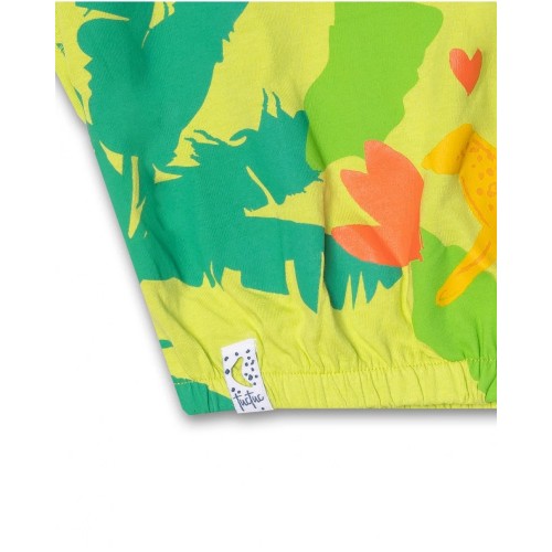 Knitted green T-shirt with a yellow and red tropical print for a girl